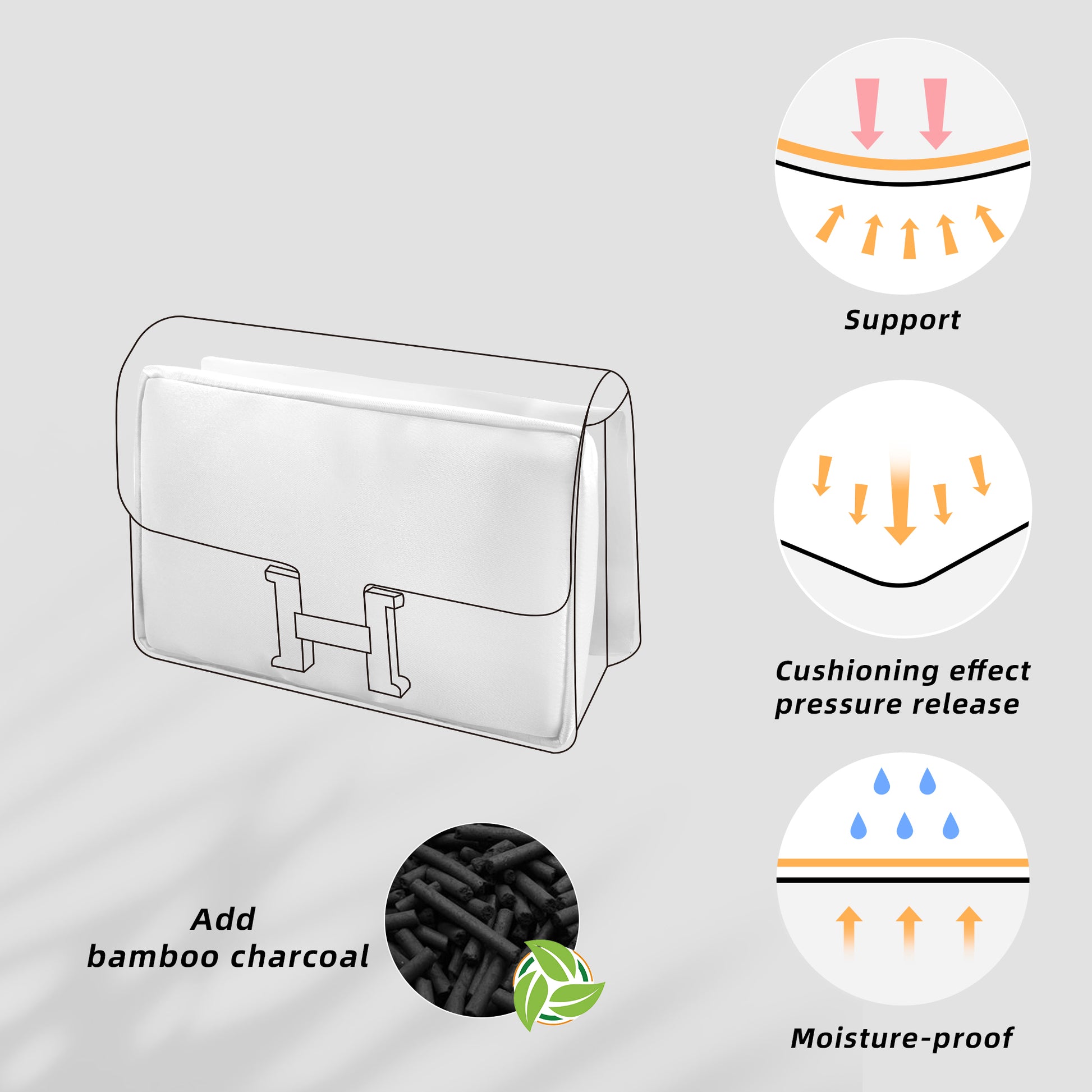 👜.가방의 가치 향상: 내부에 첨단 대나무 숯 메모리 폼을 적용해 탄력적이고 밀착력 있는 구조로 가방 형태를 완벽히 유지하며 습기 환경으로부터 보호합니다. 마치 새것 같은 상태를 오래도록 유지해 드립니다.