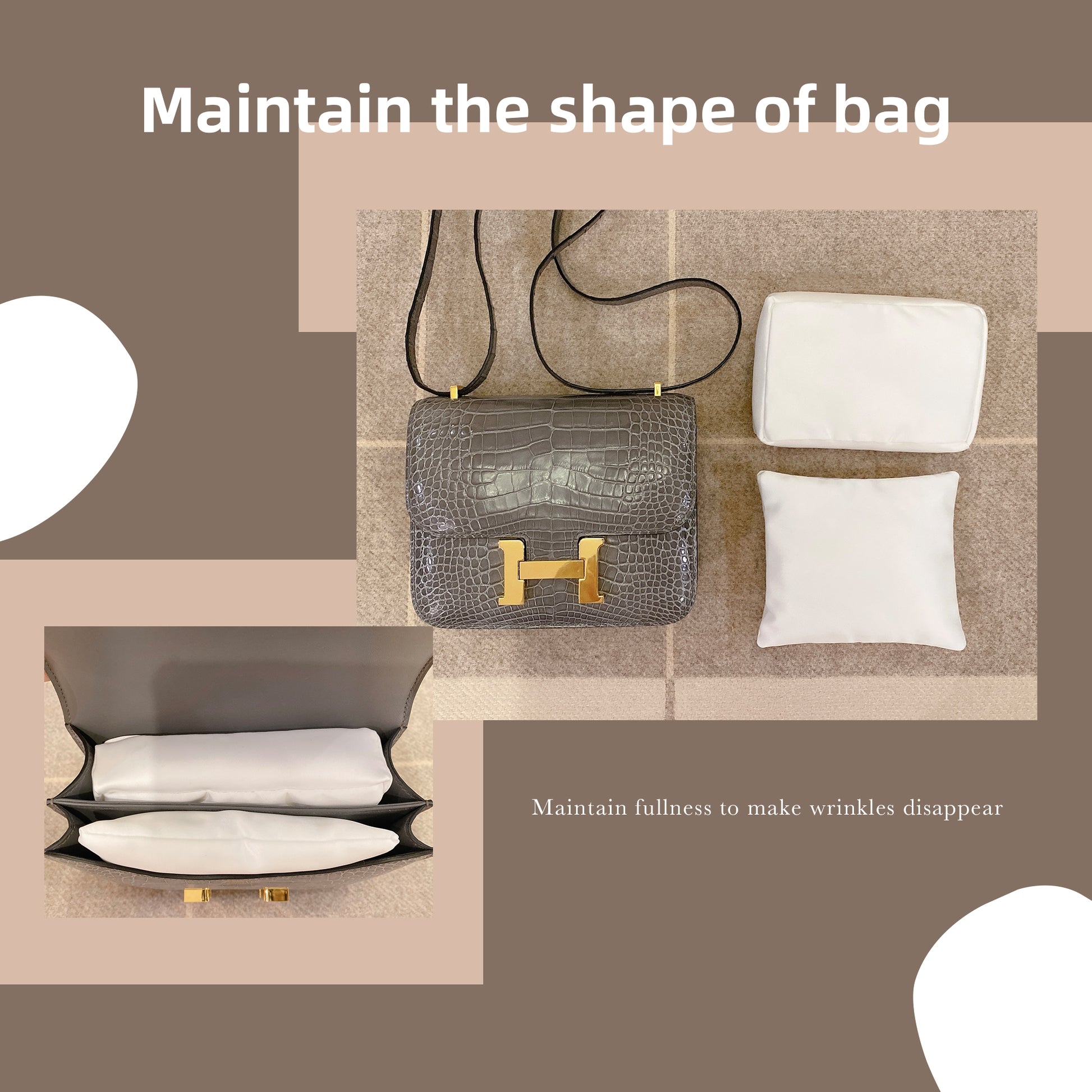 👜.하이엔드 디자인: 저희 가방 베개는 고급 새틴 소재로 제작되어 세부 마감까지 수작업 처리됩니다. 변색 없이 매끄러운 표면으로 장기 보관 시 스크래치를 방지하며, 소중한 가방이 본연의 형태를 유지할 수 있도록 합니다.