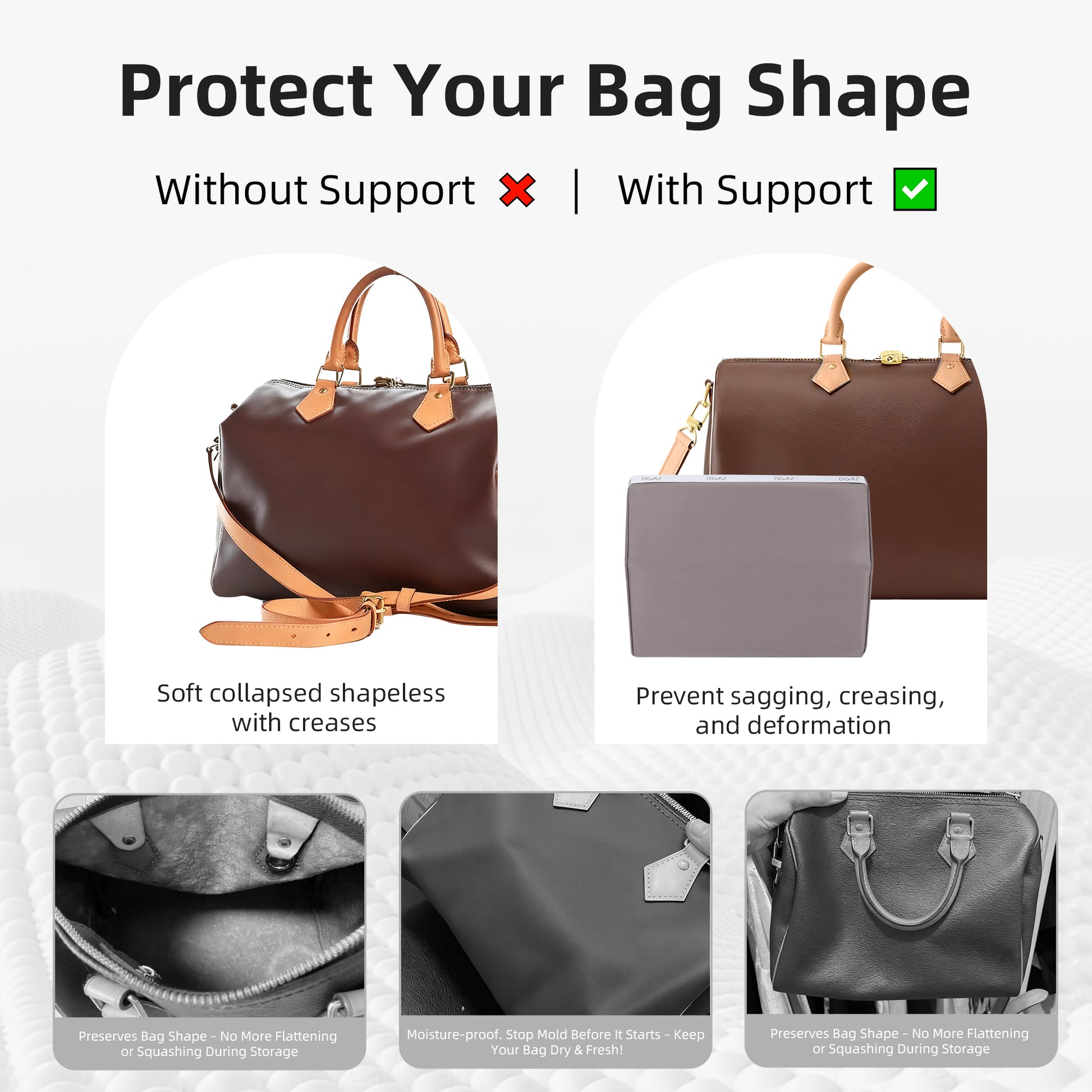- Bag more valuable: This Purse Shaper uses advanced bamboo charcoal memory foam inside, which is more snug and elastic when used, effectively allowing your favorite bag to keep its shape when preserved, as well as from the humid environment. Let the bag keep the charm of just bought.